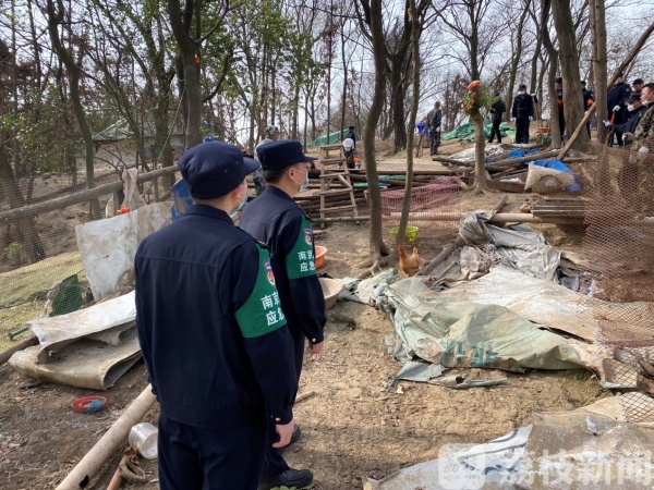 执法人员找到了正在忙碌的当事人陈某,原来疫情期间陈某经营的商铺被暂停营业,经济来源受到影响的他决定做点其他“小生意”补贴家用。一番“考察”后,他选中了较为偏僻的凤仪路,抱着侥幸心理准备在路南面的山坡上搭建“养鸡场”,没想到在搭建过程中就被城管部门查处了。执法人员严肃向陈某告知,在南京城区禁止饲养鸡等禽畜,而本就容易引起环境脏乱差的养鸡行为更是对市容环境秩序和当下疫情防控工作带来双重危害。通过执法人员的耐心宣传教育,当事人充分认识到了错误,当即保证这些饲养的鸡他将全部带回家,并将积极配合工作人员对现场进行清理。