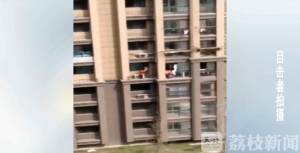 据目击者介绍,上午10点左右,小区14号楼四楼一户人家,有三个孩子分别从两扇窗户爬出来,其中两个孩子站在设备平台上。另外一个穿黄色羽绒服的男孩,从窗户爬出后,站在墙体外的腰线上,而这个腰线的宽度仅15厘米左右,这名男孩徒手抓住栏杆和墙壁,沿着约10米高的腰线,在没有任何保护措施的情况下,走到了隔壁房间的设备平台。整个过程大约半分钟,目击者看得是心惊胆战。