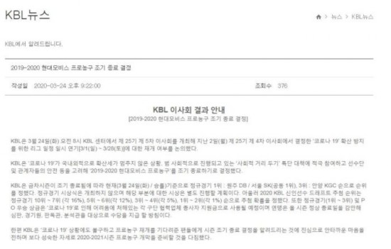 本赛季KBL原定常规赛将进行至4月初,之后还有季后赛。公告中称,在新冠肺炎尚未停止传播的情况下,KBL积极响应各种应对新冠肺炎的政策,考虑到球队及相关人士的安全等问题,决定提早结束2019-20赛季KBL联赛。