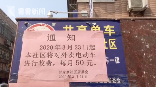 3月23日,在陕西西安,不少外卖骑手反映,甘家寨小区针对进入的外卖电动车每月收取50元。