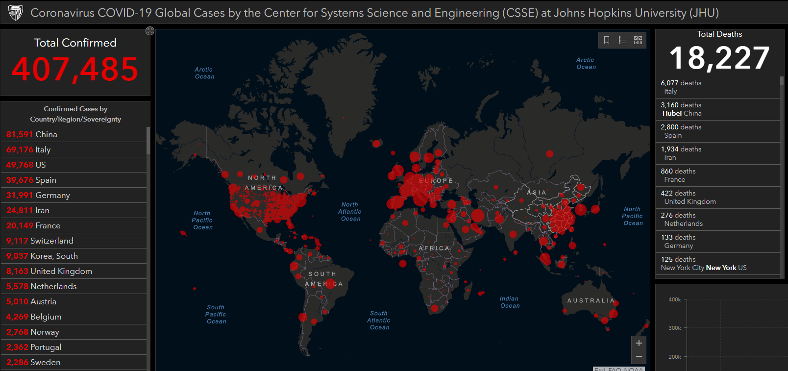 【约翰斯·霍普金斯大学:全球新冠肺炎病例超40万例】