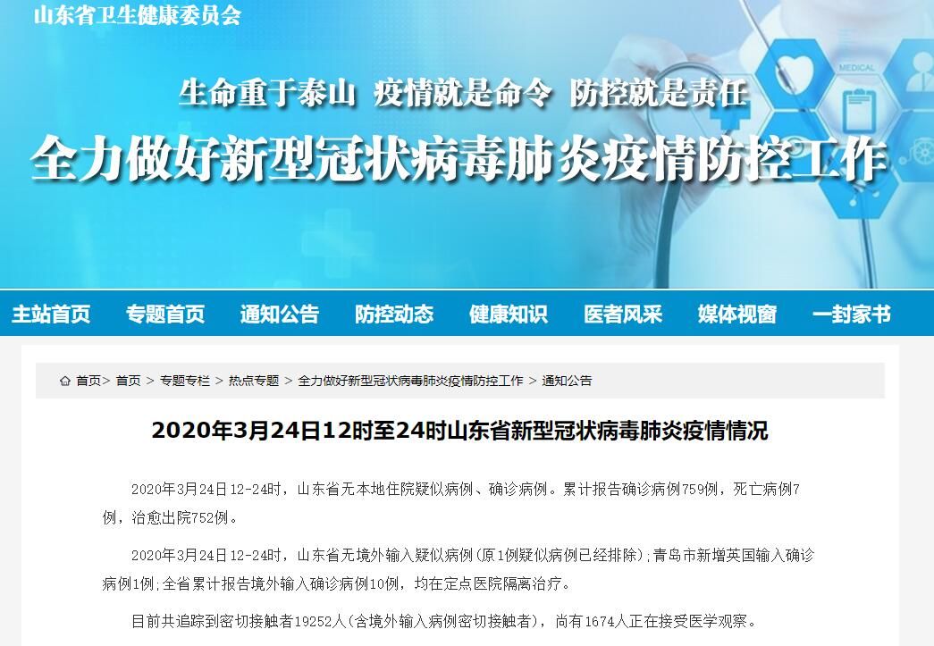 荔枝新闻讯 据山东卫健委官网消息,2020年3月24日12-24时,山东省无本地住院疑似病例、确诊病例。累计报告确诊病例759例,死亡病例7例,治愈出院752例。