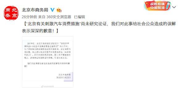 荔枝新闻讯 据北京商务局官方微博消息,“北京有关刺激汽车消费措施”尚未研究论证,北京商务局对此事给社会公众造成的误解表示深深的歉意。