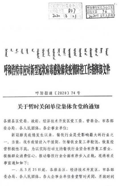 图说:呼和浩特市疫情防控指挥部发布通知,暂时关闭单位集体食堂,鼓励下馆子支持餐饮业。 官方图