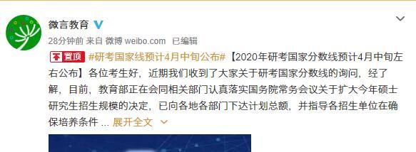 据教育部新闻办公室官方微博消息,目前,教育部正在会同相关部门认真落实国务院常务会议关于扩大今年硕士研究生招生规模的决定,已向各地各部门下达计划总额,并指导各招生单位在确保培养条件和质量基础上,抓紧安排确定分专业招生计划。招生单位分专业招生计划上报汇总完毕后,教育部将尽快划定2020年国家分数线,预计4月中旬左右公布,相关复试工作安排将视疫情和高校开学情况另行通知。