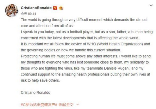 C罗曾在社交媒体写道:“整个世界都在经历艰难的一段时刻,这要求我们所有人投入最大限度的关注。