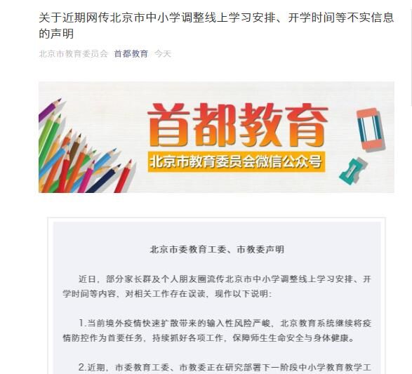 近日,部分家长群及个人朋友圈流传北京市中小学调整线上学习安排、开学时间等内容,对相关工作存在误读,现作以下说明: