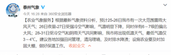 泰州市将出现低温天气