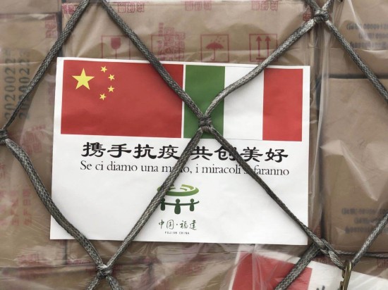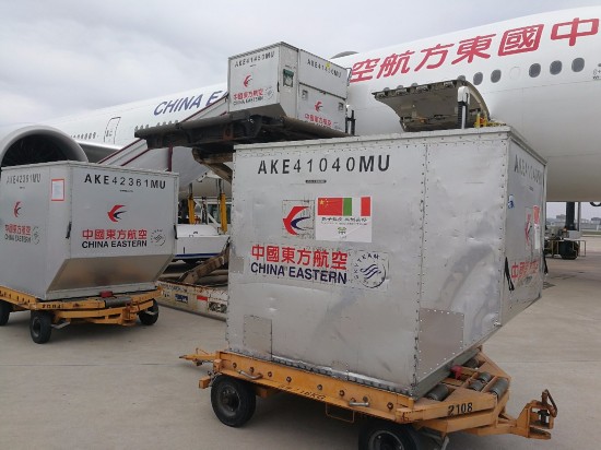 3月24日下午,三地的捐赠防疫物资分批集结福州机场货站,东航在福州机场的货运人员彻夜奋战,按照精密仪器等特殊货物的保障要求,在12小时内高效完成收运、打板、驳运等流程。飞机抵达之后,印有中意两国国旗和“携手抗疫、共创美好”字样的抗疫物资迅速完成装机。