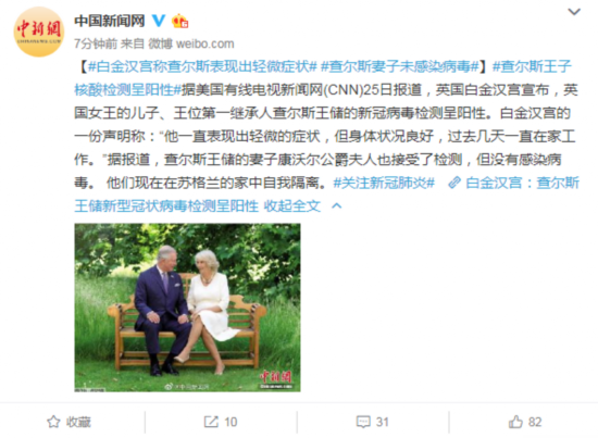 【#白金汉宫称查尔斯表现出轻微症状# #查尔斯妻子未感染病毒#】#查尔斯王子核酸检测呈阳性#据美国有线电视新闻网(CNN)25日报道,英国白金汉宫宣布,英国女王的儿子、王位第一继承人查尔斯王储的新冠病毒检测呈阳性。白金汉宫的一份声明称:“他一直表现出轻微的症状,但身体状况良好,过去几天一直在家工作。”据报道,查尔斯王储的妻子康沃尔公爵夫人也接受了检测,但没有感染病毒。 他们现在在苏格兰的家中自我隔离。