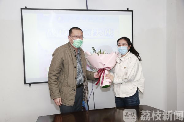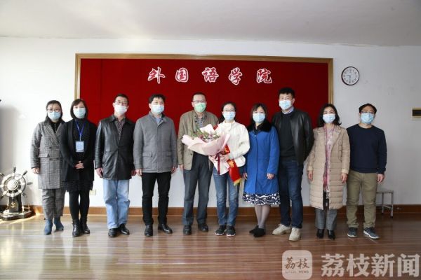 江苏科技大学党委常委、副校长汤建为高秀老师献上了象征美好祝愿的鲜花,代表学校送上感谢,他表示,外国语学院的“家文化”深入人心,高秀老师“舍小家,为大家”展现了大爱,她的“逆行”让人由衷赞赏,希望务必做好防护,平安去、平安回,期待凯旋归来。