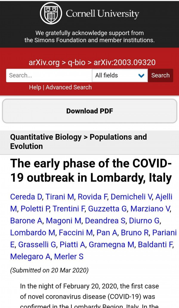 研究报告称在1号病人确诊前,病毒已经在伦巴第大区南部很多市镇传播。通过研究伦巴第大区的5830个确诊病例,研究人员向前追溯,构建出传染链条。从而得出结论,从1月1日-29日,在伦巴第大区有零星散发的病例,而从1月30日-2月19日,新发病例越来越多,仅2月18日一天就有60例之多。两天之后的20日,意大利1号病人被确诊。