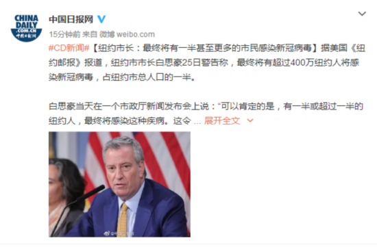 据美国《纽约邮报》报道,纽约市市长白思豪25日警告称,最终将有超过400万纽约人将感染新冠病毒,占纽约市总人口的一半。