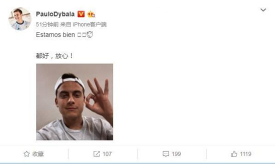 迪巴拉发文称:“都好,放心!”并配上了自己的一张自拍,图片中迪巴拉面带微笑,还做了一个大大的“OK”手势。