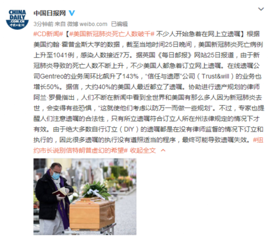 根据美国约翰·霍普金斯大学的数据,截至当地时间25日晚间,美国新冠肺炎死亡病例上升至1041例,感染人数接近7万。据英国《每日邮报》网站25日报道,由于新冠肺炎导致的死亡人数不断上升,不少美国人都急着订立网上遗嘱。在线遗嘱公司Gentreo的业务周环比飙升了143%,“信任与遗愿”公司(Trust&will)的业务也增长50%。据信,大约40%的美国人最近都立了遗嘱。