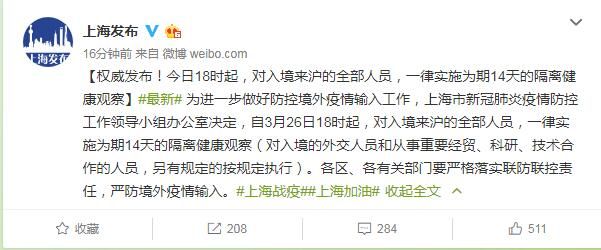 荔枝新闻讯 据上海市政府新闻办公室官方微博“上海发布”消息,为进一步做好防控境外疫情输入工作,上海市新冠肺炎疫情防控工作领导小组办公室决定,自3月26日18时起,对入境来沪的全部人员,一律实施为期14天的隔离健康观察(对入境的外交人员和从事重要经贸、科研、技术合作的人员,另有规定的按规定执行)。各区、各有关部门要严格落实联防联控责任,严防境外疫情输入。