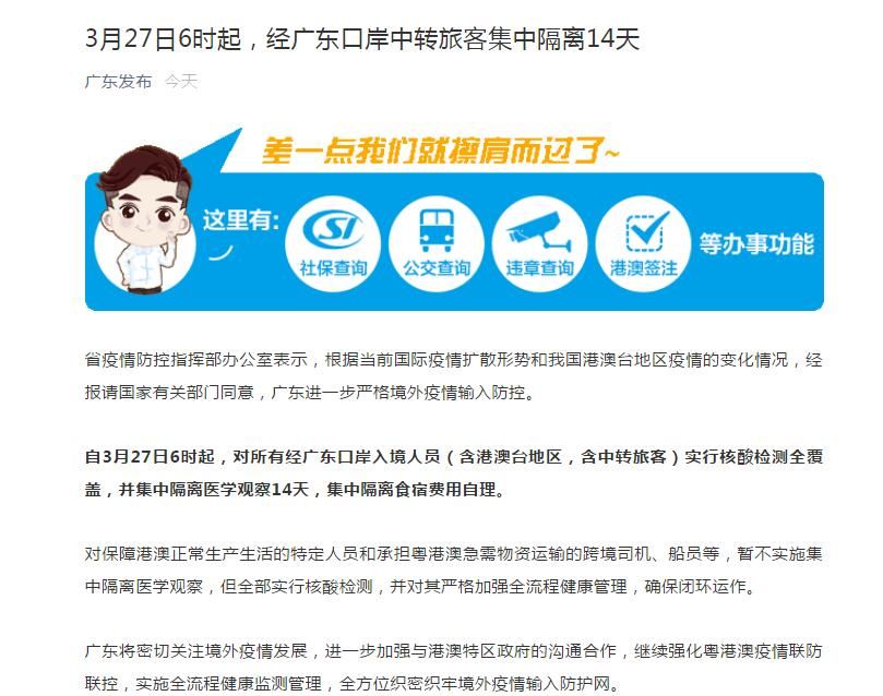 自3月27日6时起,对所有经广东口岸入境人员(含港澳台地区,含中转旅客)实行核酸检测全覆盖,并集中隔离医学观察14天,集中隔离食宿费用自理。