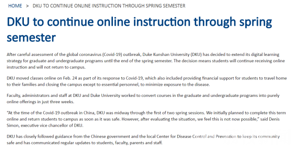 昆山杜克大学表示,学校于2月24日开启在线上课。DKU执行副总理丹尼斯·西蒙说:“整个春季学期一共有两个小学期。我们最初计划在线完成第一学期,一旦安全有了保障,就可以召集学生返校。考虑到世界各地的学生和教师返回学校所花费的时间等,我们认为在线上学期能够最大程度地减少对学校教育的干扰并最大程度地保护昆山杜克大学的全体教职工。”