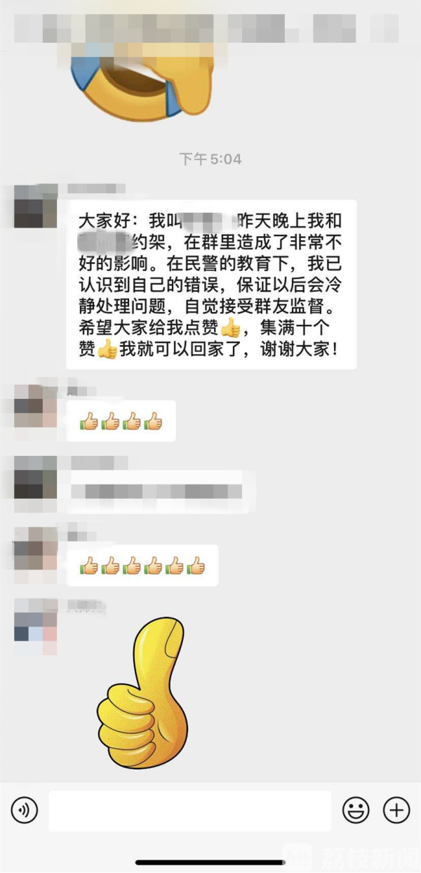民警让双方都在这个百人大群相互道歉,并且规定群友给他们点赞超过10个才行。很快,不少群友纷纷点赞。还有群友说,幸好两个人都怕警察,最终平安无事。最终,两人握手言和。