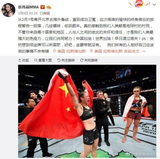 北京时间3月8日,中国第一位UFC世界冠军张伟丽在美国拉斯维加斯实现卫冕。原本一场肉搏战过后,张伟丽会返回中国与亲朋好友团聚,但受新冠肺炎疫情影响,她无奈滞留在了当地。