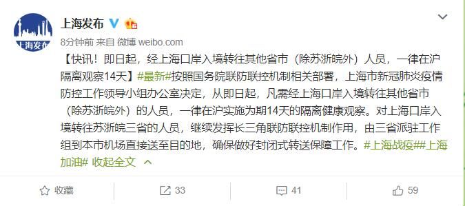 按照国务院联防联控机制相关部署,上海市新冠肺炎疫情防控工作领导小组办公室决定,从即日起,凡需经上海口岸入境转往其他省市(除苏浙皖外)的人员,一律在沪实施为期14天的隔离健康观察。对上海口岸入境转往苏浙皖三省的人员,继续发挥长三角联防联控机制作用,由三省派驻工作组到本市机场直接送至目的地,确保做好封闭式转送保障工作。