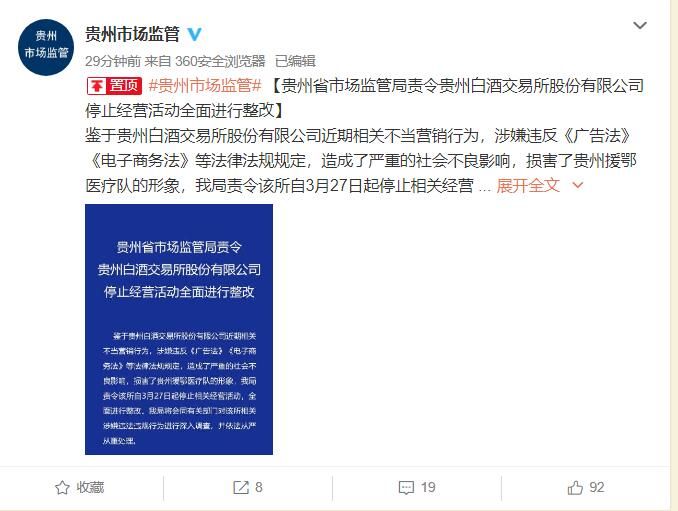 鉴于贵州白酒交易所股份有限公司近期相关不当营销行为,涉嫌违反《广告法》《电子商务法》等法律法规规定,造成了严重的社会不良影响,损害了贵州援鄂医疗队的形象,我局责令该所自3月27日起停止相关经营活动,全面进行整改。我局将会同有关部门对该所相关涉嫌违法违规行为进行深入调查,并依法从严从重处理。