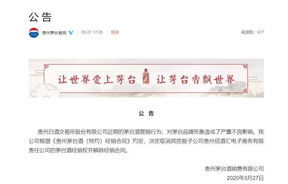 另据贵州茅台官微消息,贵州白酒交易所股份有限公司近期的茅台酒营销行为,对茅台品牌形象造成了严重不良影响。我公司根据《贵州茅台酒(特约)经销合同》约定,决定取消其控股子公司贵州佰酒汇电子商务有限责任公司的茅台酒经销权并解除经销合同。