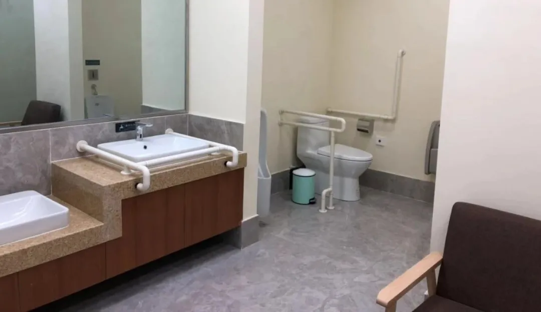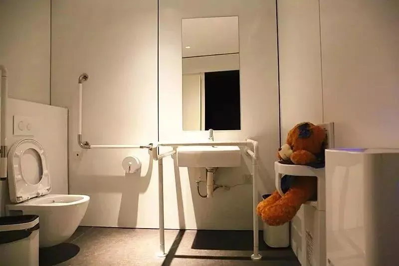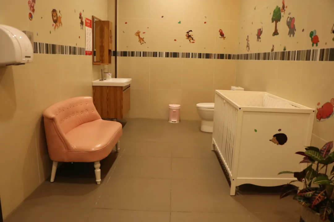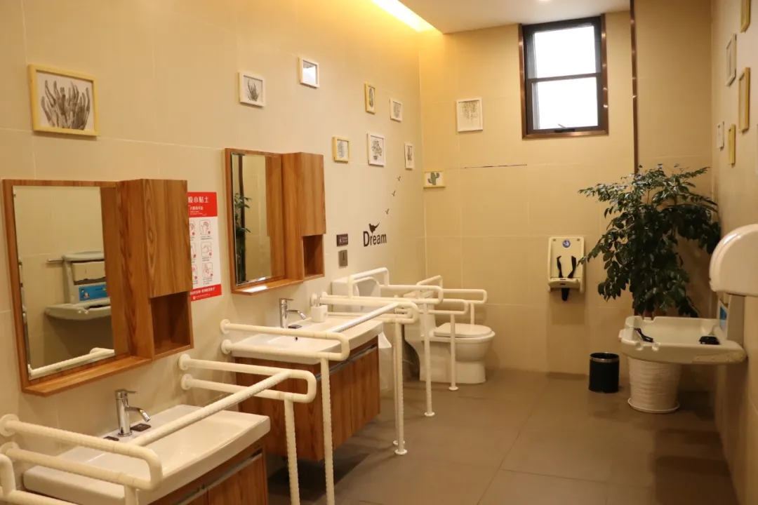 在配套设施方面,改造厕所限于条件,面积不增,但配套设施丰富完善:出纸宝和售纸机搭配让游客自由选择;香薰、空调、实时排风组成的换风系统为游客营造了舒适的如厕环境;母婴操作台,残障人士扶手等避免了特殊人士的尴尬,通过合理搭配,让设施多而不乱,兼具实用和美感。