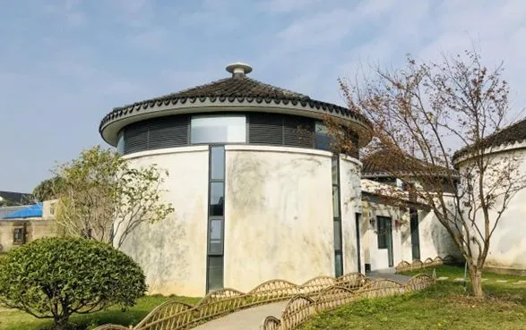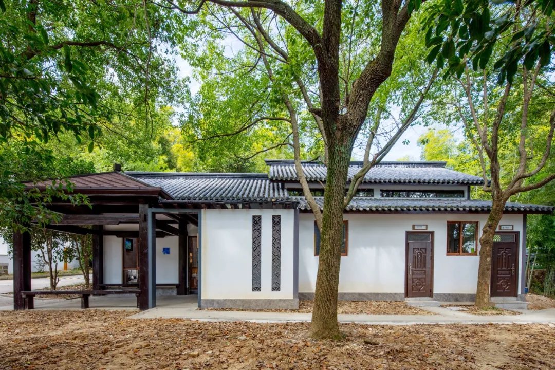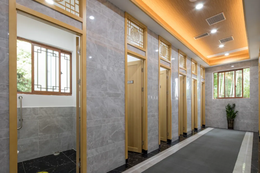 掩映在竹林之中的厕所,青砖白墙与周围仿古建筑浑然一体。