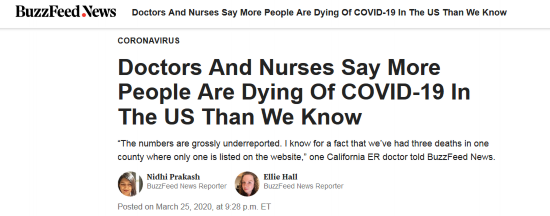 报道提到,本周早些时候,美国疫情形势最严峻的两个地区——纽约市和洛杉矶县曾发布指导意见称,医生尽量不要对病人进行(病毒)检测,除非前者认为检测将在很大程度上对患者的治疗进程产生影响。BuzzFeed说,这意味着在这两个地方,可能会出现更多这样的例子,即那些出现严重呼吸道疾病症状的人被送往医院,随后康复出院或者死亡——但无论是哪种结果,他们都不会被记录到新冠肺炎疫情相关数据中。