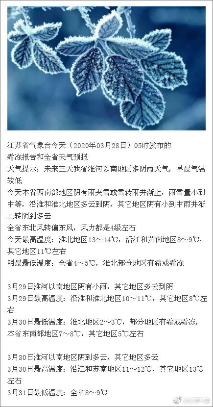 据江苏气象微博28日6时发布消息,今天江苏西南部地区阴有雨夹雪或雪转雨并渐止,雨雪量小到中等,沿淮和淮北地区多云到阴,其它地区阴有小到中雨并渐止转阴到多云,全省东北风转偏东风,风力都是4级左右,今天最高温度:淮北地区13~14℃,沿江和苏南地区8~9℃,其它地区11℃左右,明晨最低温度:全省4~5℃,淮北部分地区有霜或霜冻。