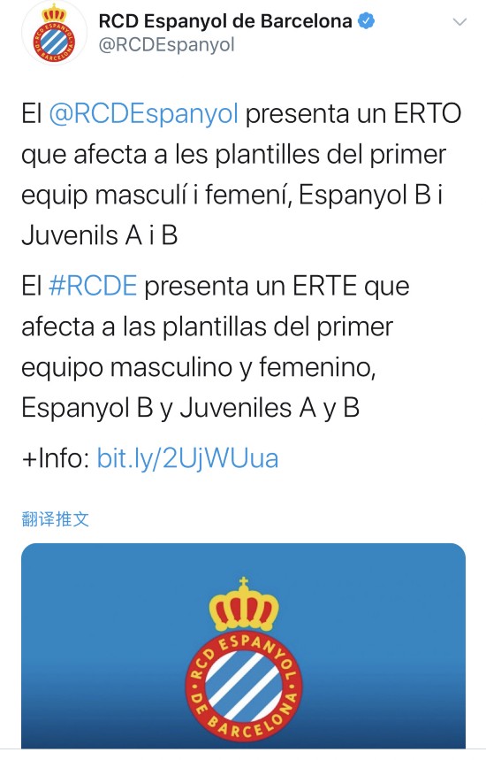 北京时间27日晚,西班牙人俱乐部官方宣布,由于赛事停摆以及疫情影响等“不可抗力”因素,俱乐部已经向西班牙劳动部门提交了一份临时雇佣条例(ERTE),将俱乐部员工以及球员暂时归为“临时失业状态”。