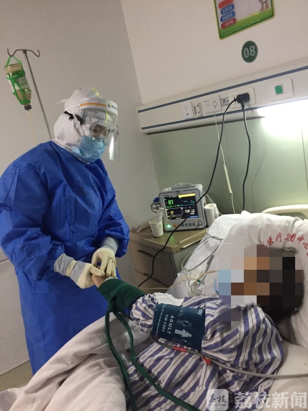 不止生活上对患者体贴入微,李敏还有着丰富经验造就的看家本领。在黄石市中医医院,一位病危的新冠病毒肺炎患者,上着呼吸机,呼吸急促,四肢硬肿,静脉非常难找,值班的三名护士静脉穿刺均未成功。李敏主动上前帮忙,反复靠手摸索,寻找能够建立液路的血管。虽然戴着三层手套增加了感触血管的难度,护目镜布满了雾气还滴水,但李敏凭借平时积累的静脉穿刺经验,在已被穿刺过的血管前端摸到还有一小段静脉可被利用,终于穿刺成功。