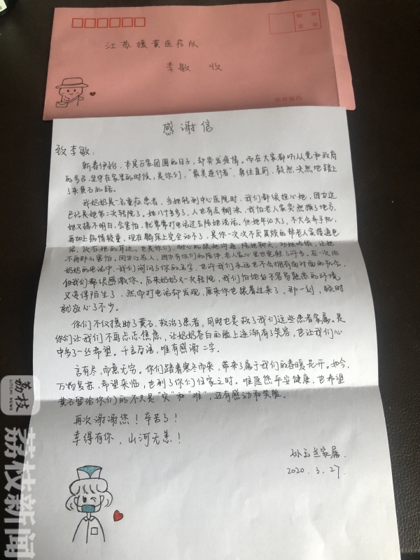 在听说了江苏队员即将撤离黄石的消息后,一名患者家属冒雨将一封感谢信送到了江苏队员的驻地。信中写道:“是你一次次不厌其烦地帮八十多岁的奶奶接通家人打去的电话,是你耐心地跟她沟通、陪她聊天、劝她吃饭,让她不再那么害怕。”李敏说,她可以叫出每个病床患者的名字,看着她护理过的叔叔阿姨、爷爷奶奶痊愈出院,是她最感到满足的事情。
