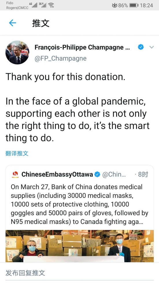 加拿大外长商鹏飞当地时间28日在社交媒体上发表推文,对中国银行向加拿大捐赠医用物资的行为表示感谢。推文说:“谢谢你们的这笔捐赠。在全球大流行的疫情面前,相互支持不仅是正确的事,也是聪明的事”。