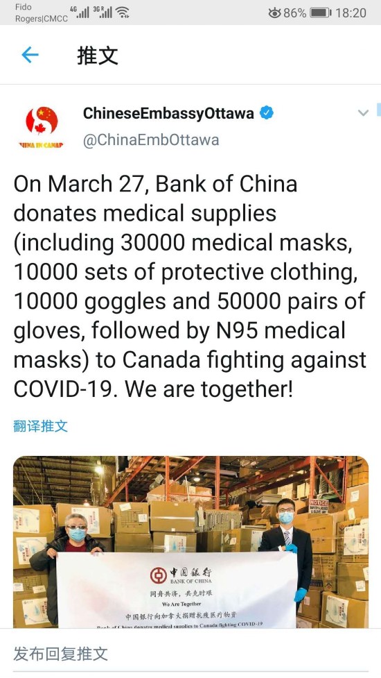 商鹏飞外长转推了中国驻加拿大大使馆之前有关中国银行向加拿大捐赠医用物资的推文。