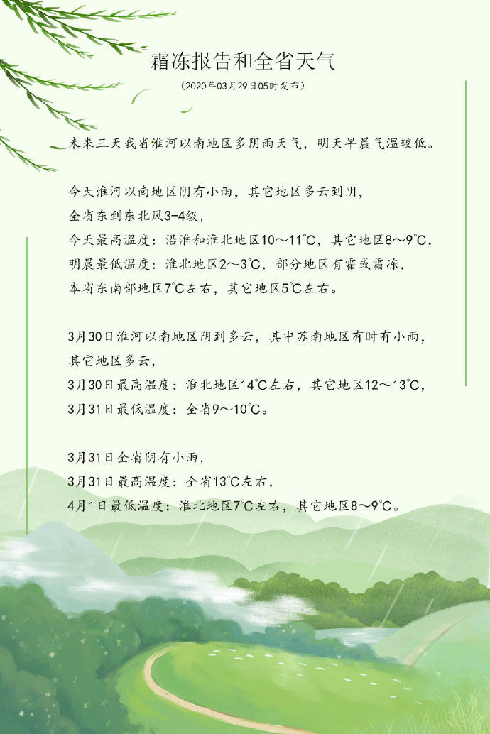 我苏网讯 刚刚,江苏省气象台发布霜冻报告:今天(3月29日)淮河以南地区阴有小雨,其它地区多云到阴,全省东到东北风3-4级,今天最高温度:沿淮和淮北地区10~11℃,其它地区8~9℃,明晨最低温度:淮北地区2~3℃,部分地区有霜或霜冻,本省东南部地区7℃左右,其它地区5℃左右。