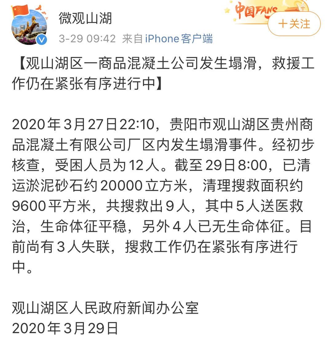 荔枝新闻讯 据微观山湖官博消息,2020年3月27日22:10,贵阳市观山湖区贵州商品混凝土有限公司厂区内发生塌滑事件。经初步核查,受困人员为12人。截至29日8:00,已清运淤泥砂石约20000立方米,清理搜救面积约9600平方米,共搜救出9人,其中5人送医救治,生命体征平稳,另外4人已无生命体征。目前尚有3人失联,搜救工作仍在紧张有序进行中。
