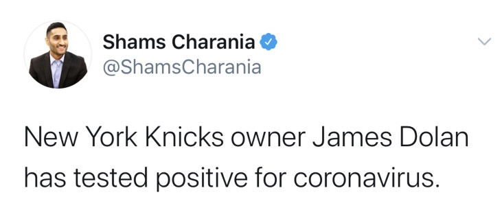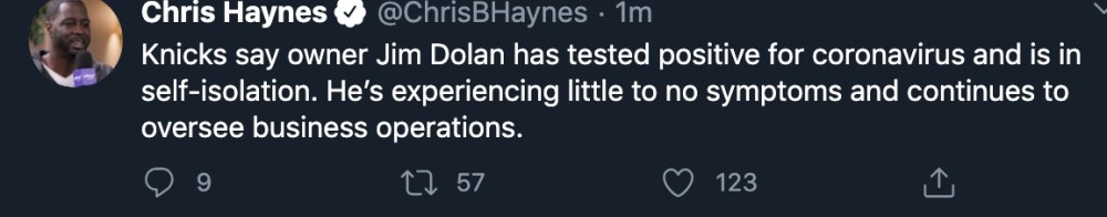 北京时间3月29日,据《The Athletic》名记沙姆斯-查拉尼亚报道,尼克斯老板詹姆斯-多兰确诊感染新型冠状病毒。另据Yahoo!体育记者克里斯-海恩斯爆料多兰已进行自我隔离,并无明显症状将继续监督球队运营工作。