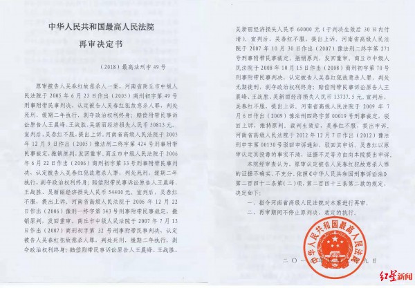 2018年9月,最高人民法院作出再审决定,认定吴春红犯故意杀人罪的证据不确实、不充分,指令河南高院进行再审;2019年10月24日,该案在吴春红服刑的浙江省金华监狱再审开庭。
