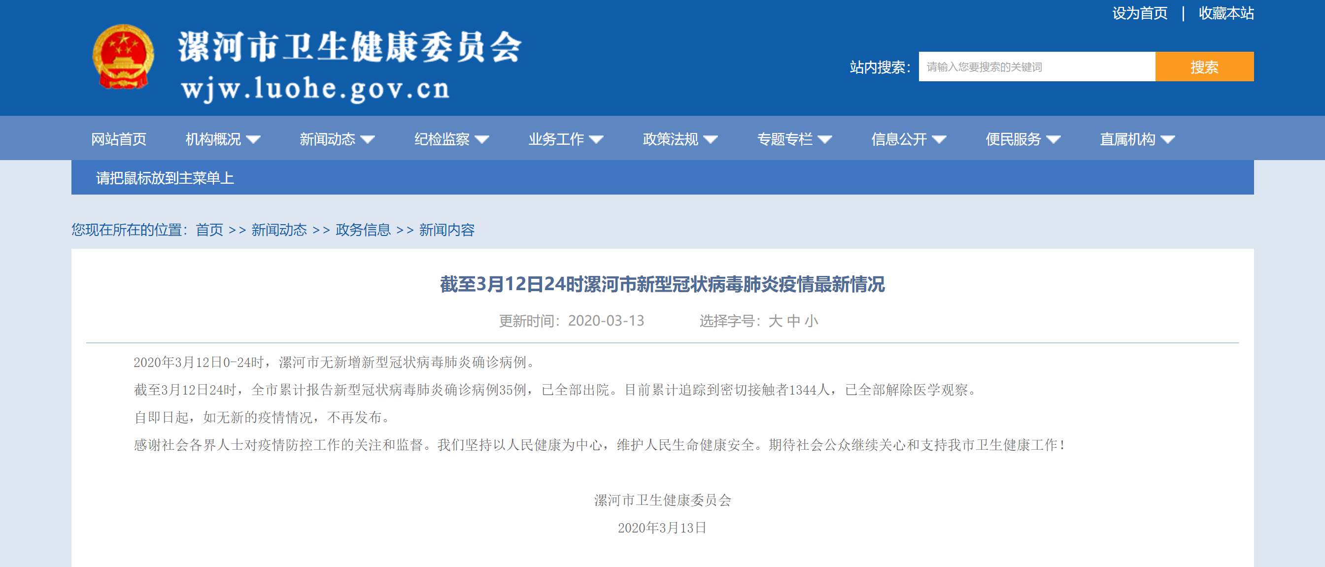 上观新闻注意到,漯河市卫健委曾在3月12日发布公告称:“自即日起,如无新的疫情情况,不再发布”。此后,官网确实再无疫情情况通报。从公告内容看,截至3月12日24时,漯河全市累计报告新型冠状病毒肺炎确诊病例35例,已全部出院,累计追踪到的密切接触者1344人也已全部解除医学观察。