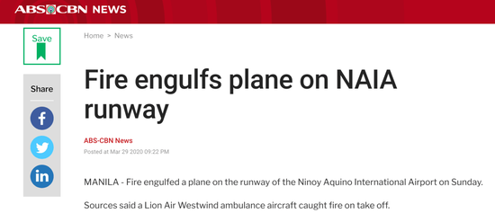 据菲律宾媒体ABS-CBN刚刚消息,在菲律宾尼诺伊· 阿基诺国际机场的跑道上,一架飞机被大火吞没。消息人士称,该飞机为一架狮航救护飞机,在起飞时起火。