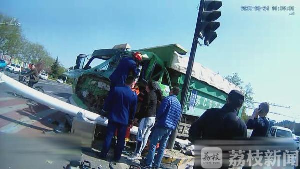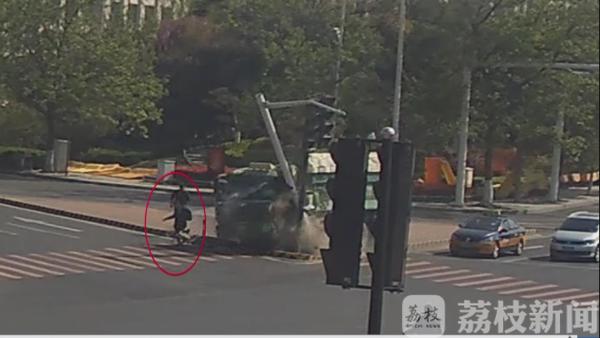 从监控画面中可以看到,在徐州市三环南路与大学路交叉口,东西方向绿灯开始闪烁变为黄灯时,车辆纷纷减速停车等候。但是,一辆渣土车却没有减速继续往前开,眼看就要撞到前方车辆,渣土车突然改变方向,冲上了道路中间的安全岛,在撞倒路灯杆后才停了下来。而此时,一名正在安全岛上骑车等候通行的市民,赶紧跳车跑开,才幸免于难!事故发生后,渣土车车头严重变形,驾驶员代某被困在车内,在消防员的营救下才得以脱身,好在这起事故没有造成人员受伤。