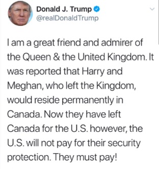 当地时间29日,特朗普发推称:“我是女王和英国的好朋友和仰慕者。据报道,离开英国的哈里和梅根将永远居住在加拿大。现在他们已经离开加拿大前往美国,但是美国不会为他们的安保付费。他们必须自费!”