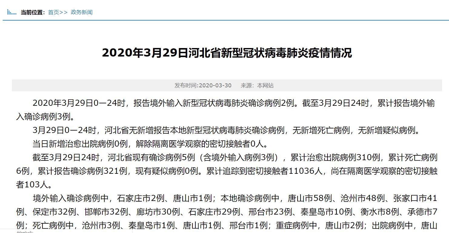 截至3月29日24时,河北省现有确诊病例5例(含境外输入病例3例),累计治愈出院病例310例,累计死亡病例6例,累计报告确诊病例321例,现有疑似病例0例。累计追踪到密切接触者11036人,尚在隔离医学观察的密切接触者103人。
