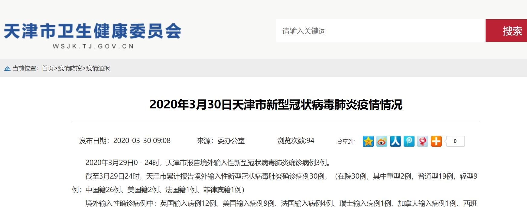 截至3月29日24时,天津市累计报告境外输入性新型冠状病毒肺炎确诊病例30例。(在院30例,其中重型2例,普通型19例,轻型9例;中国籍26例、美国籍2例、法国籍1例、菲律宾籍1例)