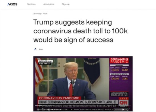 《亚特兰大宪法报》报道称,特朗普当天在新闻发布会上表示,如果能把(新冠肺炎)死亡人数“控制在10万人以内”,尽管“这是一个可怕的数字,”但他补充说,“(这表明)我们所有人就做得还不错。”