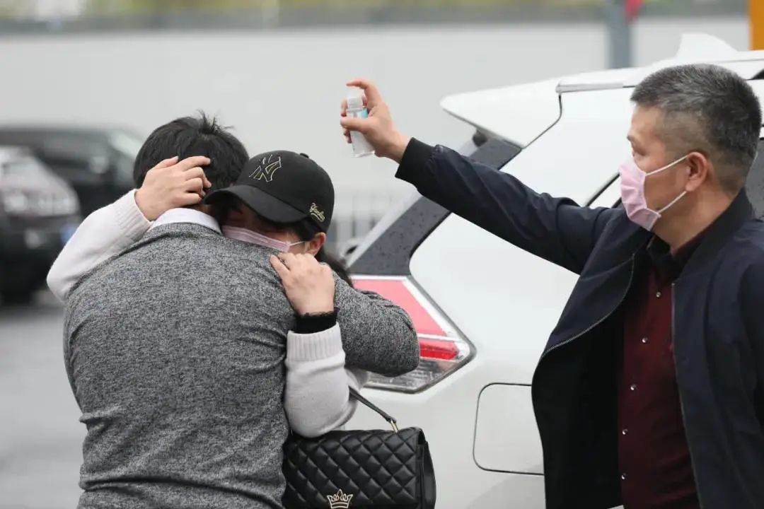 在武汉火车站,孟世奇与母亲相拥而泣,父亲在一旁向他们喷洒酒精。从中南财经政法大学毕业的孟世奇封城之前去外地同学家玩,滞留两个多月后终于回到武汉。刘宇 摄