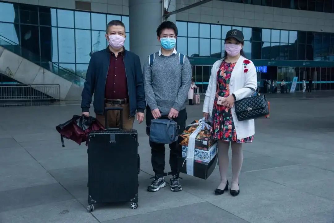 孟先生夫妇和儿子孟世奇在火车站重逢。还在上大学的孟世奇封城之前去外地同学家玩,滞留两个多月后终于回到武汉。薄高鹏 摄