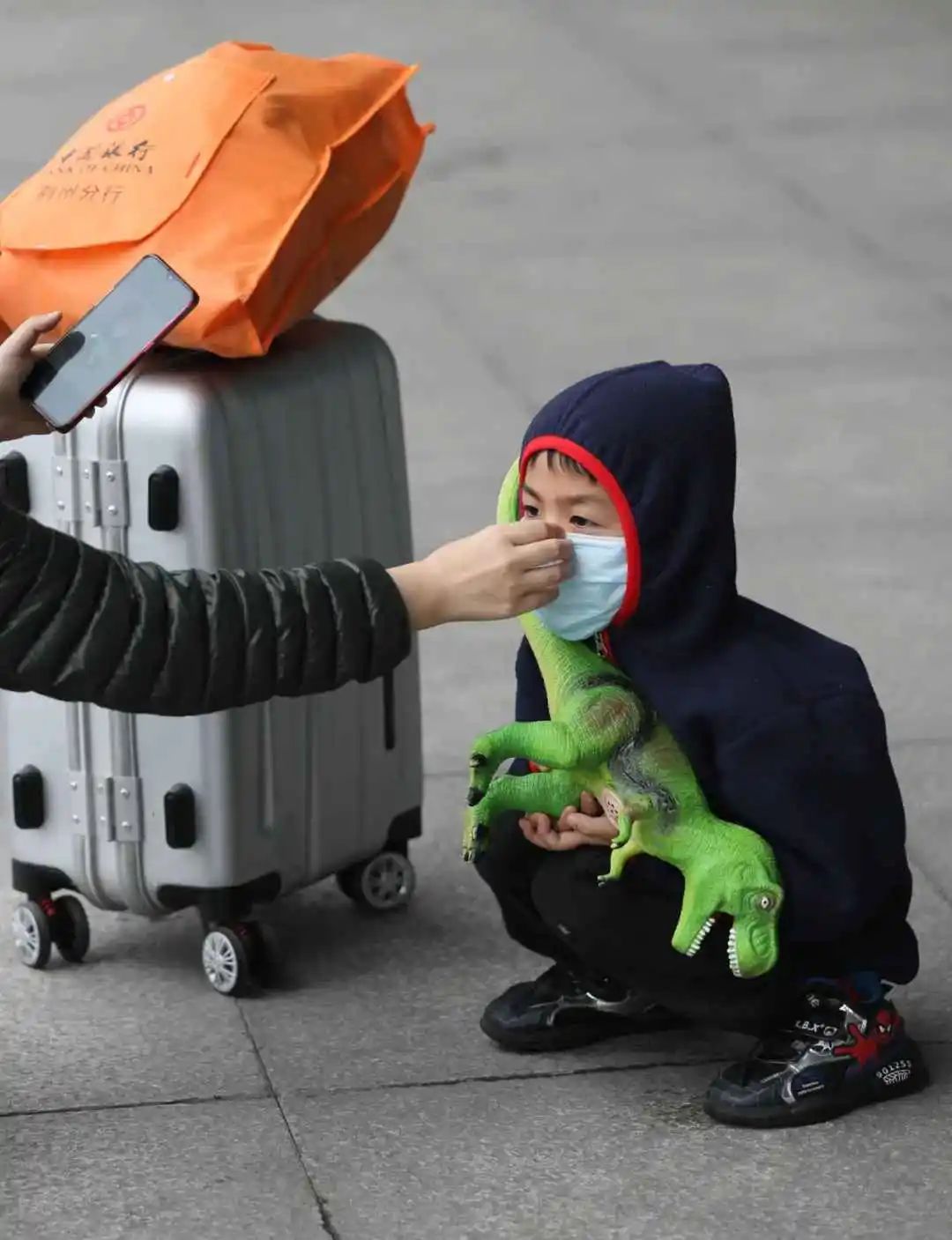 在武汉火车站,一位母亲为儿子戴好口罩。他们在外滞留两个多月后,终于回到武汉。刘宇 摄